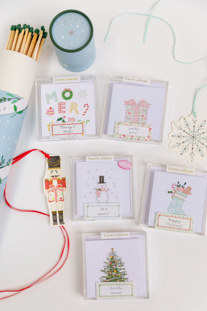 Share holiday cheer with this perfectly adorable box of hand-glittered cards featuring a tinsel tree. Six enclosure cards and six white envelopes are packaged in an acrylic box, making it a perfect gift. Book folded cards, blank on the inside.