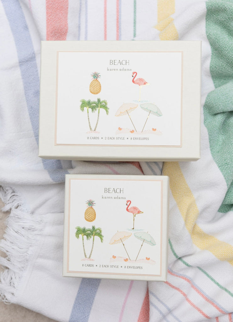 Our Beach Flamingo Gift Enclosure is printed and hand-finished in Memphis, TN. Hand crafted artwork, full color ink printed on natural white paper, foiled, hand-glittered, and paired with a vellum envelope. Book-folded enclosure card, blank on the inside.