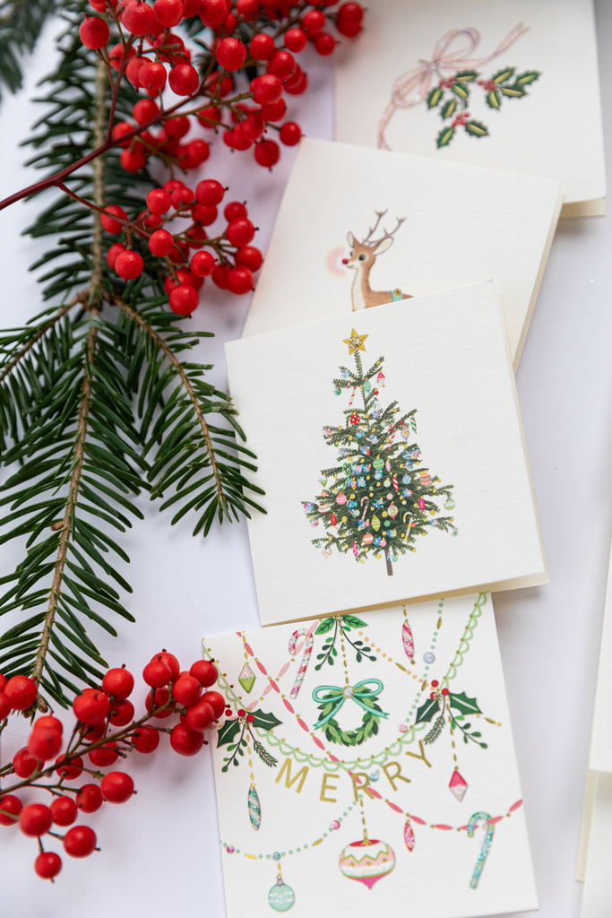 Our Festive Fir Tree Gift Enclosure is printed and hand-glittered in Memphis, TN. Hand crafted artwork, full color ink printed on natural white paper, hand-glittered, and paired with a vellum envelope. Book-folded enclosure card, blank on the inside.