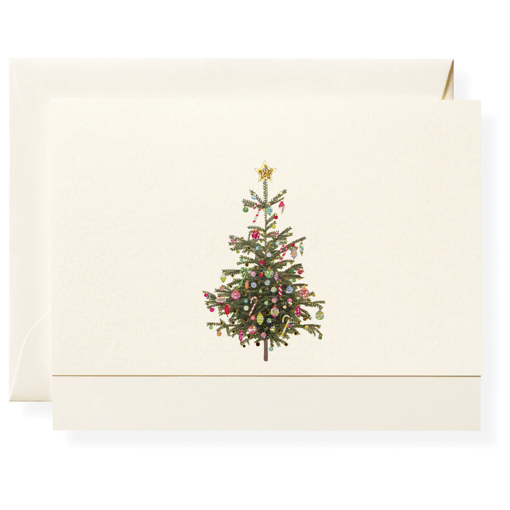 Our Festive Fir Tree Note Card is printed and hand-glittered in Memphis, TN. Hand crafted artwork, full color ink printed on natural white paper, hand-glittered, and paired with a natural white envelope. Top-folded card, blank on the inside.